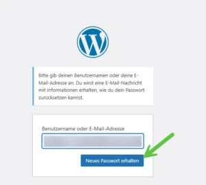 Nach dem Login zuerst auf "Passwort vergessen" klicken. Danach öffnet sich ein Fenster von WordPress. Dort Ihre Mailadresse einsetzen und auf "Neues Passwort erhalten" klicken. Sie erhalten dann auf diese Mailadresse ein Mail mit einem Link um ein neues Passwort zu erstellen.